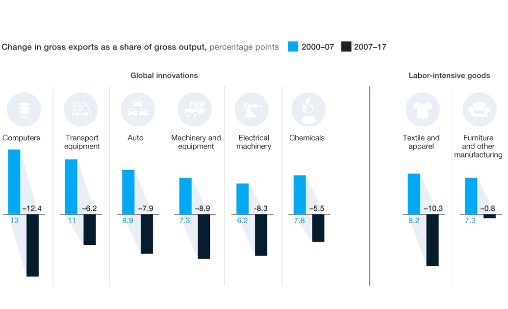 Thương mại tăng nhanh trong gần như tất cả các chuỗi giá trị toàn cầu từ năm 1995 đến năm 2007. Gần đây, cường độ thương mại (nghĩa là tỷ lệ xuất khẩu gộp trên tổng sản lượng) trong hầu hết các chuỗi giá trị sản xuất hàng hóa đã giảm. Thương mại vẫn tăng trưởng một cách tuyệt đối, nhưng tỷ lệ sản lượng di chuyển qua biên giới thế gii đã giảm từ 28,1% năm 2007 xuống còn 22,5% trong năm 2017. Tăng trưởng khối lượng giao dịch cũng chậm lại. Từ năm 1990 đến 2007, khối lượng thương mại toàn cầu tăng nhanh hơn 2,1 lần so với GDP thực tế, nhưng chỉ tăng nhanh hơn 1,1 lần so với GDP kể từ 2011.